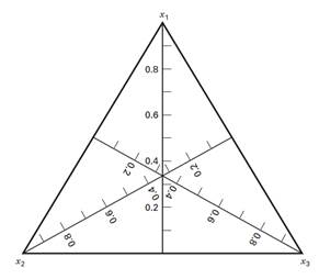 Каждая из трех сторон треугольника соответствует смеси, не содержащей третьего компонента, обозначенного на противоположной вершине. Градуированные линии от противоположных сторон к вершинам показывают содержание соответствующего этой вершине компонента.