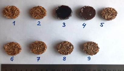 Разработаны матрицы планирования экспериментов (табл.1), изготовлены две группы образцов (по 9 образцов в каждой группе) толщиной 10 мм, диаметром 29 и 100 мм (рис.4) и проведены лабораторные исследования их основных акустических характеристик в диапазоне частот 500-6400 Гц: коэффициента звукопоглощения по стандарту ISO 10534-2 и показателя звукоизоляции (потерь при передаче звука) по стандарту ASTM E2611-19.