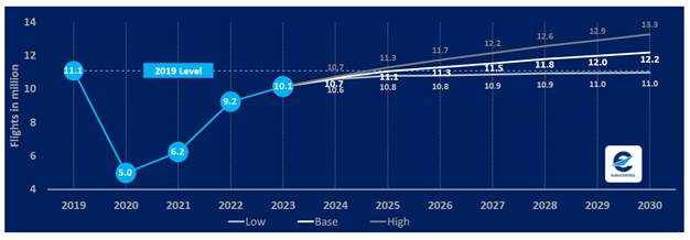 Базовый прогноз EUROCONTROL на 2025 год указывает на увеличение трафика на 3,7 % относительно 2024 года и практически полное восстановление уровня 2019 года. К 2030 году ожидается рост до 12,0–12,2 млн рейсов по базовому сценарию и до 13,3 млн — по оптимистичному.