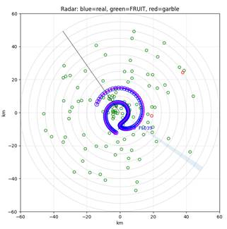 Рисунок 5. Радиолокационная визуализация сигналов в программе Python: синие — корректные ответы, зелёные — FRUIT (случайные помехи), красные — наложения (garble)