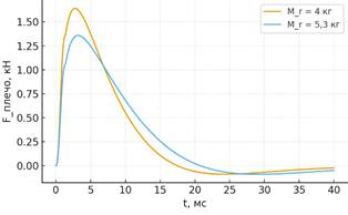 Лёгкая винтовка (33XC, 7 кг) Пик силы на плечо порядка 2,5 кН, компрессия мягких тканей около 10 мм. Это означает очень быстрый начальный разгон приклада (скорость плеча порядка 0,3–0,35 м/с уже в первые миллисекунды); большие ускорения коробки и ствола до момента вылета пули