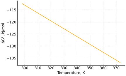 Значения ΔG° становятся более отрицательными с ростом температуры (от −112,4 кДж·моль⁻¹ при 298 K до −136,8 кДж·моль⁻¹ при 373 K), что указывает на повышенную термодинамическую благоприятность растворения фаялита при повышенных температурах.