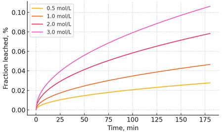 Кинетическое моделирование с использованием закона диффузии по модели сжимающегося ядра воспроизводит наблюдаемое ускорение выщелачивания с ростом концентрации кислоты; при 3,0 моль·л-1 доля прореагировавшего вещества через 180 мин значительно превышает таковую при 0,5 моль·л-1 при одинаковой температуре.