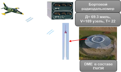 При совместном использовании DME с радиомаяком VOR или ILS каналы спариваются, и в бортовом оборудовании DME устанавливается соответствующий частотно-кодовый канал. DME передает трёхбуквенные позывные каждые 30–40 с, длительностью до 5 с. В VOR/DME позывные совпадают с VOR, при ILS — с курсовым радиомаяком. Военная система TACAN работает аналогично, а в гражданской авиации используется только дальность; совмещённая с VOR система называется VORTAC. Принцип работы DME основан на измерении времени прохождения сигнала от самолета до радиомаяка и обратно, с задержкой наземного оборудования на 50 мкс (Рис 3.).