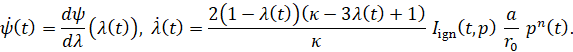 . Примем закон горения пороха в интегральной форме закона Вьей с постепенным воспламенением пороха и подборкой его параметров по экспериментальным данным (скорости, давления) [1–3, 5–8]. Это позволяет встроить реалистичную кинетику горения пороха [1–3, 7, 8]. Предполагаем, что для повышения точности будем калибровать модель по экспериментальным данным о давлении и скорости пули и по данным производителей пороха [5, 6].