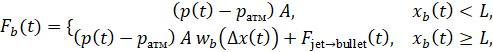 Традиционный подход, основанный на использовании интегральных характеристик импульса и энергии отдачи, может быть использован для оценок во многих задачах. Там, где это неприемлемо, для реализации возможности расчета действия силы отдачи во времени предлагаются модели [1, 2], в которых динамика скорости пули и давление на дульном срезе рассчитываются по программам внутренней баллистики и входят как исходные данные для расчета силы, импульса, энергии отдачи и силы на плечо.
