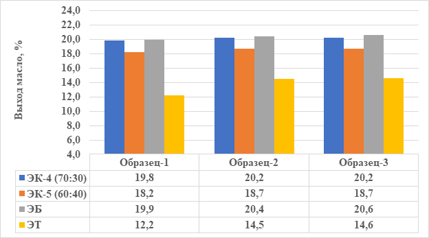 Из приведенного выше рисунка 1 видно, что выход масла (экстракционная композиция экстракционный бензин+этанол) в составе образца-1 в ЭК-4 (70:30) был близок к 90%, тогда как в ЭК-5 (60:40) этот показатель показал значение ниже 80%. Также выход масла в чистом растворителе спирте показал значение на 20% ниже по сравнению с экстракционным бензином. В образце-2 при степени измельчения 60% выход масла из лепестка по ЭК-4 (70:30) составил 97%, а по ЭК-5 (60:40) — 83%. Из графиков видно, что доказано, что увеличение количества этанола в составе композиций растворителей обратно пропорционально выходу масла. Показатели образца-2 по выходу масла были выбраны для последующих исследований.