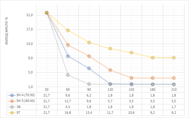 Изменение времени экстракции в зависимости от типов растворителей. Экстракционный бензин — 40-50 минут, ЭК-4 (70:30) — 70 минут, ЭК-5 (60:40) — 100-110 минут, Этанол — 180-210 минут.
