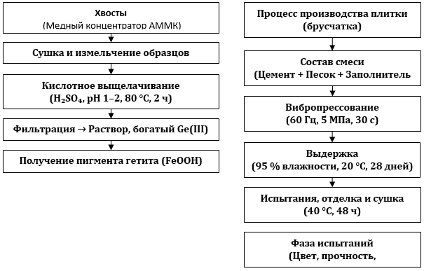 Данное исследование стремится заполнить этот пробел, установив полный процесс — от кислотного выщелачивания хвостов АГМК до осаждения гетита и применения в желтых тактильных плитках — тем самым замыкая цикл управления металлургическими отходами и технологий инклюзивного строительства.
