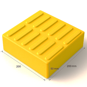 - Функциональный дизайн для тактильных дорожек — Производимые плитки (200 × 200 × 50 мм) с восемью приподнятыми параллельными рёбрами обеспечивают как тактильное, так и визуальное ориентирование, соответствуя стандарту ISO 23599:2012 для тактильных покрытий. Полная глубина жёлтого цвета, достигнутая за счёт равномерного распределения пигмента по всей бетонной матрице, гарантирует долгосрочную видимость цвета и контраст (ΔE* > 35) даже после износа или механического истирания поверхности.