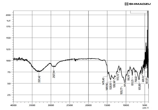 Обсуждение и результаты. С целью определения ингибиторных свойств борсодержащего органического ингибитора на начальном этапе исследования были проведены инфракрасные спектроскопические анализы. Исследования выполнялись с использованием ИК-Фурье спектрометра FT-IR фирмы SHIMADZU (Япония) в диапазоне 400–4000 см⁻¹. Данная спектральная область является удобной для идентификации функциональных групп и позволяет фиксировать основные валентные и деформационные колебания, характерные для органических и борсодержащих соединений.