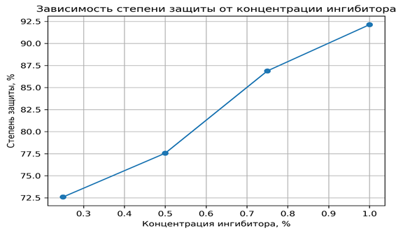 Из диаграммы, представленной на рисунке 3, видно, что с увеличением концентрации ингибитора степень защиты металла последовательно возрастает. При концентрации 0,25 % защитная эффективность является относительно низкой, тогда как при достижении концентрации 1,0 % наблюдается её максимальное значение. Это объясняется формированием на поверхности металла устойчивого защитного слоя ингибитора.