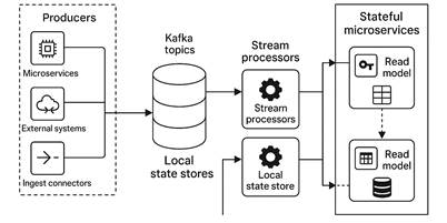 On this basis, the study proposes a reference architecture for stateful microservices that treats the event log as the core of the system and confines databases to projections. Figure 1 presents this structure in a form adapted from the Kappa architecture for IoT data management in smart farming [8]. Producers, including microservices and external systems, publish domain events to Kafka topics. Stream processors implemented in Erlang or other languages consume these topics, apply business rules, and update local state stores with service-specific aggregates and indexes. Each stateful microservice maintains one or more read models in key–value, document, or columnar stores, populated only by domain events or internal change streams; cross-service joins and a shared relational schema are avoided, and collaboration proceeds through event exchange.