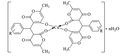 Рисунок 1. Комплексные соединения меди(II) на основе арил-метилен-бис(4-гидрокси- 6-метил-2H-пиран-2-онов) с общей формулой [3. С. 38-40].