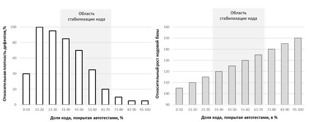 Как видно из рис. 1, при увеличении доли кода, покрытого автотестами, сохраняется приблизительно линейный рост общей кодовой базы проекта. При этом отчётливо выделяется интервал значений плотности покрытия (30–70 %), в котором наблюдается снижение плотности дефектов за счёт роста числа автоматических регрессионных тестов.