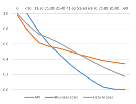 В результате построения предиктивной модели были получены зависимости плотности дефектов DD от доли методов, покрытых unit-тестами, для различных слоёв слоистой архитектуры приложения. Соответствующие зависимости представлены на рис. 2.