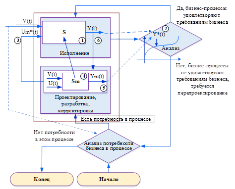 В представленной схеме элементами управления являются: объект управления – бизнес-процесс (1,5); цель управления Y*(t), отражающая степень удовлетворённости клиентов (2); ресурсы управления Um*(t) (3); модель бизнес-процесса Sm, используемая для проектирования и корректировки процесса (4); субъект управления – бизнес-аналитик, принимающий решения о необходимости изменений (5); а также механизм обратной связи (6), обеспечивающий сопоставление фактических и целевых показателей. Выходом исполняемого процесса является Y(t), управляемым входом – U(t), а неуправляемым, но наблюдаемым входом – V(t), представляющим требования клиентов. Выход модели бизнес-процесса обозначен как Ym(t).