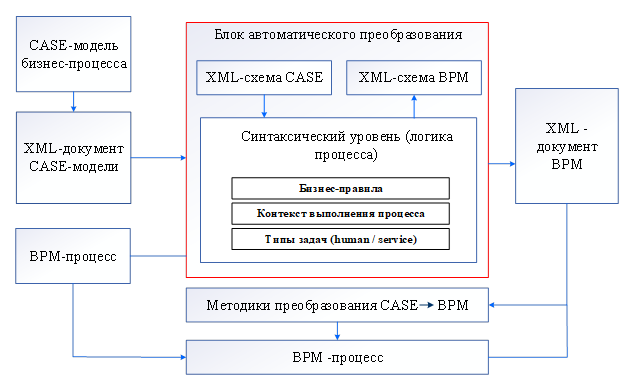 Языки описания и исполнения бизнес-процессов, используемые в системах класса BPMS, включая BPEL, основаны на синтаксисе XML, что обеспечивает формальное представление структуры процесса и возможность его автоматизированной обработки. Вместе с тем автоматизированное преобразование CASE-моделей в исполняемые модели BPMS не ограничивается только синтаксическим преобразованием XML-структур, а включает анализ и интерпретацию логики бизнес-процесса.