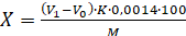 V0 - volume of 0.1 mol/l sodium hydroxide solution used for the titration of sulfuric acid at a concentration of 0.05 mol/l in the control experiment, ml; V1 - volume of 0.1 mol/l sodium hydroxide solution used for titration of the analyzed solution, ml; K - correction coefficient to the titer of 0.1 mol/l sodium hydroxide solution; 0.0014 - the amount of nitrogen equivalent to 1 ml of a 0.05 mol/L solution of sulfuric acid, g; M - mass of the sample, g [7].