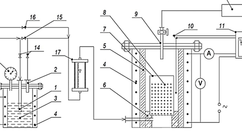 1) аргоновая трубка; 2) трубка для переноса смеси аргона и водяного пара аргоновая трубка 2) трубка для переноса смеси аргона и водяного пара; 3) парогенератор; 4) электрообогреватель; 5) реактор; 6) арматурное кольцо; 7) реакционный стакан с перфорированным дном; 8) сырье; 9) газоотводная труба; 10) термопара; 11) агрегат КС–2; 12) манометр; одомер.
