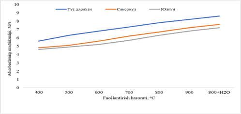 Из-за низкого содержания в древесном угле неорганических веществ, угольные адсорбенты, полученные на их основе, имеют относительно низкую зольность. Зольность образцов увеличивалась с повышением температуры активации. По мере увеличения температуры пиролиза уменьшение количества органических веществ в образцах приводит к образованию неорганических соединений и количественное соотношение между органическими соединениями изменяется. Поэтому наблюдается увеличение количества золы.