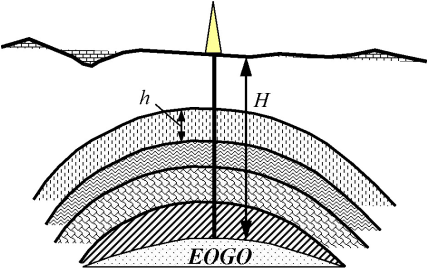 –средняя объемная плотность горных пород; hi-толщина слоя горных пород;; рср–средняя плотность пород, образующих срез, рср= 2,65 т/м3; H– суммарная толщина горных пород в разрезе крқшки хранилища, g– ускорение свободного падения 9,8 м/см2, приведена на рис.1 [6-10].