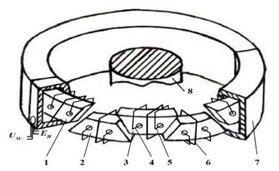 Результаты и обсуждение. При контроле трансформатора напряжения (ТН) с разъемной магнитной цепью КФП охватывает шину 8. Под воздействием модуляционных амперных выключателей в каждом полупериоде напряжения питания магнитная цепь входит в состояние насыщения, и проводимость цепи резко снижается для продольного поля, создаваемого управляемым током. Когда ток модуляции проходит через нулевое значение, проводимость магнитной цепи возвращается к исходному значению. В результате, благодаря стабильности модуляционных амперных выключателей в измерительной обмотке, возникает электродвижущая сила (ЭДС), пропорциональная управляемому току.