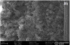 На рисунке 1 представлены изображения расширенного вермикулита (A) и ионита (B), полученного путем сшивки вермикулита с полиэтиленполиамином и формальдегидом, полученные с помощью сканирующего электронного микроскопа.