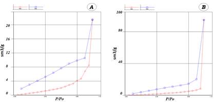 Рисунок 2. Адсорбция и десорбция паров азота, а также гистограмма для вермикулита и ионита, полученного с участием вермикулита и полиэтиленполиамина (A — вермикулит, B — ионит на основе вермикулита и полиэтиленполиамина).