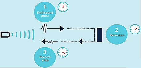 Принцип работы УД следующий (рис.1 ): они посылают высокочастотные, короткие звуковые импульсы, как правило 40 кГц, через равные промежутки времени. Они распространяются в воздухе со скоростью звука. Когда импульсы ударяются о препятствие- они отражаются обратно как эхо сигнала датчика, который сам вычисляет расстояние до объекта по времени между сигналом передачи и сигналом приема [6]. Измеряется время возврата эха для расчета расстояния и обнаружения движения, даже за препятствиями. В системах климатической техники они регулируют и компенсируют влияние температуры и влажности, интегрируясь с контроллерами для реального времени корректировки [7]. Это обеспечивает стабильную работу в помещениях с неравномерным присутствием людей и неравномерной загруженностью помещения в течении суток.