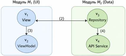 Для каждого элемента определяется величина внешнего сцепления, учитывающая суммарный вес всех зависимостей, пересекающих границу модуля. Обобщённой характеристикой модульности выступает нормированная доля межмодульных связей, усреднённая по элементам системы. Низкие значения данной метрики свидетельствуют о хорошей локализации ответственности и устойчивости системы к точечным изменениям. Пример графа изображен на рисунке 1.