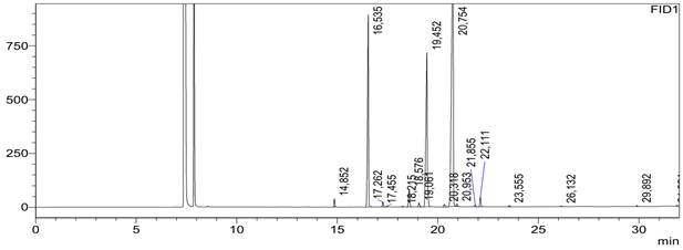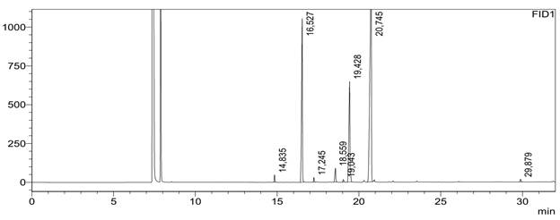 Рисунок 1. Хроматографическое распределение жирных кислот нерафинированного хлопкового масла, полученного из сорта XinLuZao-78