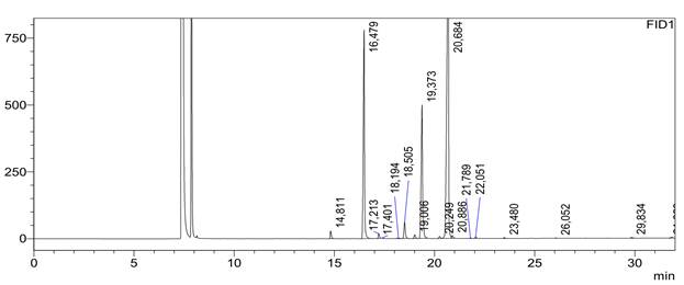Жирнокислотный состав образцов (нерафинированного хлопкового масла) определяли методом газожидкостной хроматографии. Образцы подвергали процессу метилирования с использованием раствора метилата натрия в метаноле [7]. Полученные метиловые эфиры жирных кислот анализировали на газовом хроматографе (GC-2030, Shimadzu, Япония), оснащённом автоматическим устройством ввода проб, инжектором, колонкой (SP-2560, 100 m × 0,25 mm × 0,2 µm) и пламенно-ионизационным детектором.