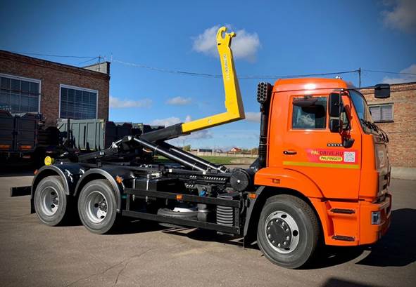 This article discusses innovative features and design solutions for improving the efficiency of the hydraulic system, calculated for the actual working loads of a 25-tonne hook loader on a three-axle 6×4 chassis. An overview of the main components of the machine is presented: the subframe with guide rollers, the extendable boom with a hook, the support hydraulic frame and an additional rotating frame for unloading containers. The principle of operation and areas of application of such equipment are described, and ways to improve its efficiency are considered. In particular, engineering solutions are proposed: the use of reinforced hydraulic cylinders and high-strength steels, as well as solutions aimed at increasing reliability, load capacity and the speed of loading and unloading operations.