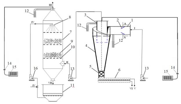 Figure 1. Principal scheme of the experimental installation for two-stage purification of dusty air: 1-duct; 2-string coagulator; 3-exhaust pipe; 4-cyclone; 5-sluice gate; 6-screw; 7-scrubber; 8-spray nozzle; 9-moving nozzle; 10-support grid; 11-tank for sludge collection; 12- micromanometers; 13-fans; 14-filter-patron AFA; 15-rotameter, 16-pump; technological flows: and II-dusty air; III-purified air; IV-irrigation water; V-captured fluff; VI-captured mineral particles; VII-contaminated water