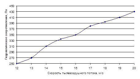 From Fig. 3 shows that at a flow velocity at the first stage of 12 m/s the hydraulic resistance of the cyclone is 250 Pa, and the degree of air purification is 90.1 %. At further increase of the flow velocity up to 20 m/s the value of hydraulic resistance of the cyclone increases up to 430 Pa, respectively the degree of purification increases up to 96 %. According to the results of experiments, the optimum values of dust-air flow velocity 17 m/s, cleaning efficiency 99.9 % and hydraulic resistance of the cyclone - 380 Pa were determined. During the experiments we also determined the total hydraulic resistance of the two-stage installation (Fig.4).