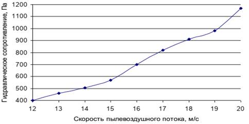 In order to reveal the influence of the fractional composition of cotton dust on the efficiency of air purification in the two-stage unit, a series of experiments were carried out. Measurements of head loss were carried out by measuring the pressure at the inlet and outlet of the apparatuses using U-shaped micromanometers. The difference of the total head at the inlet and outlet of the apparatuses was taken as the hydraulic resistance of the process line. Energy losses in the apparatuses at different regime parameters were estimated by the value of hydraulic resistance. During the experiments the velocities of dust-air flow varied from 12 to 20 m/s.