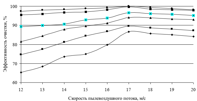 From the received exerimental data it follows that with increase of input speed of a dust-air stream from 12 to 17 m/s the efficiency of cleaning increases up to 86,6 % (at a fraction of particle size <5) and 99,98 % (fraction >60 microns), the further increase of speed up to 20 m/s negatively influences efficiency of cleaning, i.e. efficiency of cleaning decreases from 84,2 % to 98,2 %.