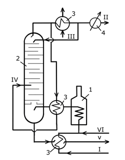 Рисунок 1. Модернизированная схема установки стабилизации газового конденсата (УСК): 1 – печь подогрева; 2 – ректификационная колонна; 3,4 – холодильники; I – сырой ГК; II – сопутствующие газы; III – лёгкая флегма; IV – пары на конденсацию; V – стабильный ГК; VI – фракция для экстрагента.