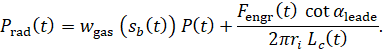 A key feature is that the gas volume V(t)is computed from a strictly geometric function V(x,P)defined in Part 2 (case → freebore → leade → bore → optional outside region), while case expansion is represented by a smooth pressure-driven transition η(P)between two reference initial free volumes. Powder combustion is described by an integral Vieille-type law with progressive ignition I_ign (t), calibrated using experimental data and manufacturer references. The post-muzzle stage includes an “opening nozzle” model for mass outflow and the reactive jet force (“uncorking”) applied at the muzzle plane [4–9, 13–14].