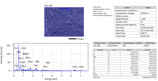 Содержание цинка (Zn) составляет 1,67% по массе. Этот показатель характерен для отходов цинкового завода, что свидетельствует о сохранении перспектив повторного извлечения цинка, однако его содержание относительно низкое по сравнению с первым образцом. Также в составе клинкера обнаружен элемент медь (Cu) в количестве 3,02% (по массе), что указывает на возможность эффективного извлечения цинка и меди в технологических процессах.