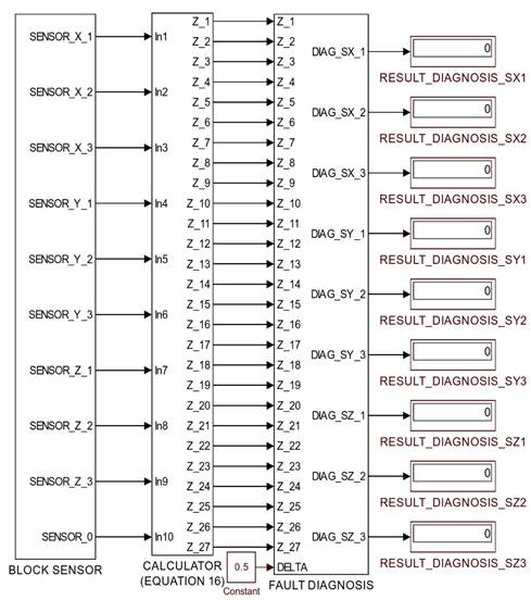 In the subsequent step, a schematic representation of the fault diagnosis algorithm for the scenario involving three fault groups is illustrated in Fig. 7. In this model, the sensor block is implemented according to equations (2)–(8), while the computation block is constructed based on equation (16). The diagnostic decision block is realized using the Stateflow tool, which performs 54 logical comparisons to determine fault conditions. The diagnosis results are provided at the output in the form of a binary signal, where a value of 1 indicates a faulty sensor and a value of 0 denotes a good sensor.