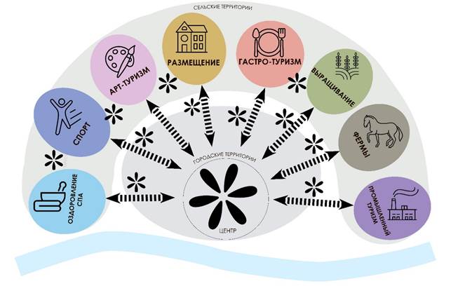 Функциональное наполнение туристических узлов формируется с учетом пяти принципов построения модели туристического ареала: