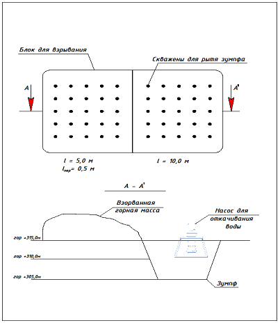 – после проведения взрывных работ выполняется устройство зумпфа, в который устанавливается насосное оборудование для организованной откачки воды;