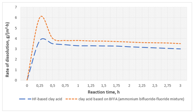 The tendency for the dissolution rate to decrease in clay acid obtained with the participation of ammonium bifluoride-fluoride occurs much more smoothly compared to conventional clay acid. This means that such an acid provides a more uniform and long-lasting effect on the rock, which is extremely important for acid treatment processes.