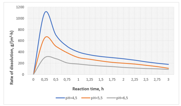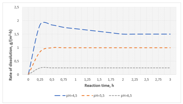For the composition with pH 6.5, the average quartz dissolution rate is approximately 0.4 g/(m²·h); for the composition with pH 5.5, this value increases by nearly 2.5 times and equals 0.98 g/(m²·h); for the composition with pH 4.5, the dissolution rate reaches 1.52 g/(m²·h).