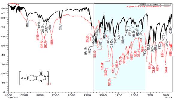 Figure 2. IR spectra of the complex formed by quinazolin‑4(3H)-one and AgNO₃ (1). Black spectrum → pure quinazoline; Red spectrum → AgNO₃ + quinazoline complex |