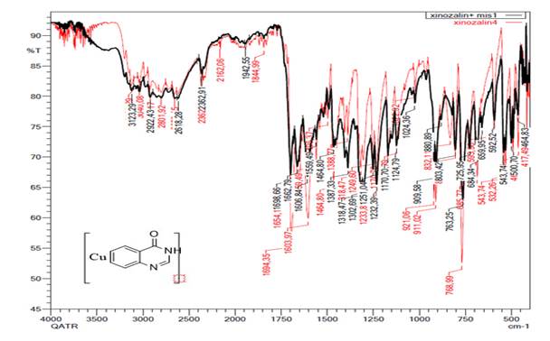 Figure 4. IR spectra of the complex formed by quinazolin‑4(3H)-one and Cu²⁺ (1). Red spectrum → pure quinazolin-4(3H)-one, Black spectrum → Cu²⁺ + quinazoline complex. |