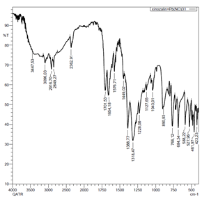 3400–2800 cm⁻¹ region: O–H/N–H and C–H stretching vibrations In the complex spectrum, a broad, high‑intensity band is observed around 3447 cm⁻¹, indicating that the hydrogen bonding system within the molecule has been strengthened under the influence of Pb(II) ions. In quinazoline, the corresponding bands (3123–2920 cm⁻¹) appear in a narrower form. The C–H stretching vibrations in the 2849–2916 cm⁻¹ range are slightly weakened in the complex spectrum, suggesting that the electron density around the ring has been redistributed following coordination with Pb(II).