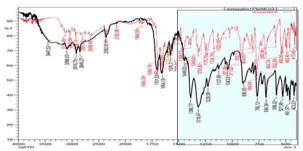 Figure 6. IR spectra of the complex formed by quinazolin‑4(3H)-one and Pb(NO₃)₂ (1) — Red spectrum → pure quinazolin‑4(3H)-one, Black spectrum → Pb(NO₃)₂ + quinazoline complex. |